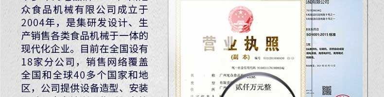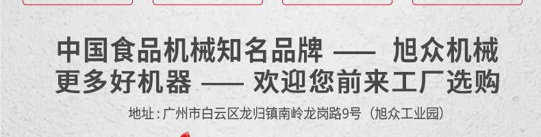 廣州旭眾食品機械有限公司是一家集科研開發(fā),生產(chǎn)設計,營銷服務為一體的現(xiàn)代化生產(chǎn)企業(yè)。現(xiàn)代化生產(chǎn)車間,精湛制造技術(shù),所產(chǎn)機械歷經(jīng)市場重重考驗,不斷贏得海內(nèi)外客戶的贊譽。