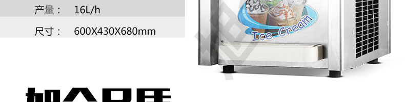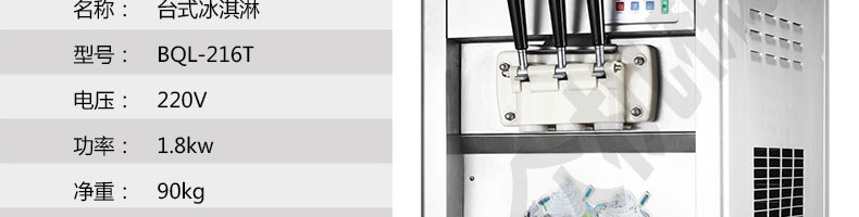 BQL-216T臺(tái)式冰淇淋機(jī),●選用國際名牌成熟制冷配套件和高效壓縮機(jī),融合旭眾精湛工藝輔以嚴(yán)格的質(zhì)量控制流程,使產(chǎn)品整體性能及品質(zhì)得以全面提升?!癫捎萌珨?shù)字電腦控制系統(tǒng),選用名牌優(yōu)質(zhì)電器元件,先進(jìn)的生產(chǎn)工藝,故障診斷,軟硬任意調(diào)制,自動(dòng)修復(fù)功能,安全精確,可靠性更高?!駥I(yè)成熟制冷系統(tǒng)設(shè)計(jì),選用世界名牌大功率專用壓縮機(jī),大大縮短冰淇淋成型時(shí)間,相同時(shí)間內(nèi)冰淇淋產(chǎn)量大幅度增加,使您生意火爆時(shí)依然得心應(yīng)手,為您創(chuàng)造財(cái)富?!癜踩椒€(wěn)的機(jī)械攪拌系統(tǒng),噪音更低、振動(dòng)更小,使整機(jī)運(yùn)行性能達(dá)到國際先進(jìn)水平。●確保進(jìn)料溫度在0°C~35°C;環(huán)境溫度5°C~40°C勻可正常使用。