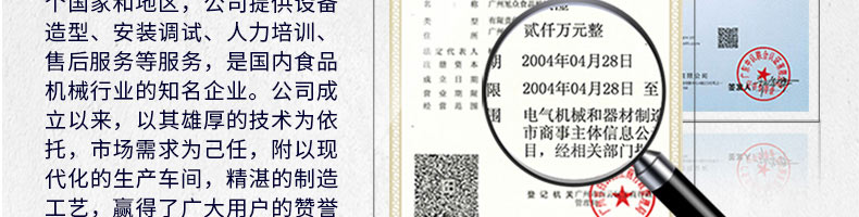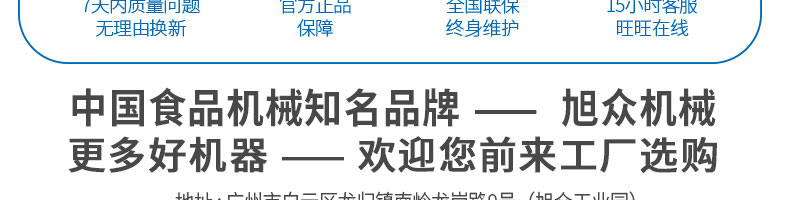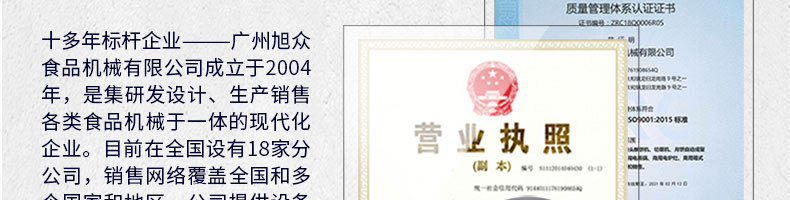 廣州旭眾食品機(jī)械有限公司是一家集科研開發(fā),生產(chǎn)設(shè)計(jì),營銷服務(wù)為一體的現(xiàn)代化生產(chǎn)企業(yè)?,F(xiàn)代化生產(chǎn)車間,精湛制造技術(shù),所產(chǎn)機(jī)械歷經(jīng)市場(chǎng)重重考驗(yàn),不斷贏得海內(nèi)外客戶的贊譽(yù)。