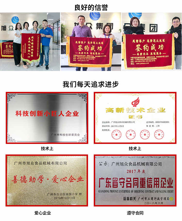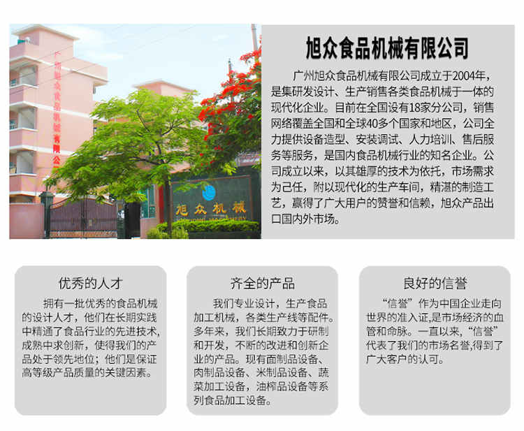 廣州旭眾食品機械有限公司是一家集科研開發(fā),生產(chǎn)設(shè)計,營銷服務(wù)為一體的現(xiàn)代化生產(chǎn)企業(yè)。現(xiàn)代化生產(chǎn)車間,精湛制造技術(shù),所產(chǎn)機械歷經(jīng)市場重重考驗,不斷贏得海內(nèi)外客戶的贊譽。