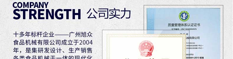 廣州旭眾食品機械有限公司是一家集科研開發(fā),生產(chǎn)設(shè)計,營銷服務(wù)為一體的現(xiàn)代化生產(chǎn)企業(yè)?,F(xiàn)代化生產(chǎn)車間,精湛制造技術(shù),所產(chǎn)機械歷經(jīng)市場重重考驗,不斷贏得海內(nèi)外客戶的贊譽。