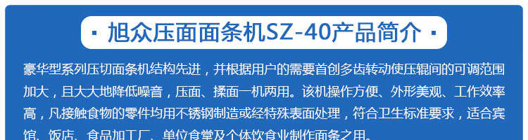 SZ40、SZ60壓面面條機系列,本機壓面、揉面一機兩用,用于制作面條、云吞皮、糕點、面點等食品,生產(chǎn)的產(chǎn)品韌性大、耐煮、不易斷,適合于賓館、飯店、食堂、面包廠及各類面點加工單位或個體商戶使用。