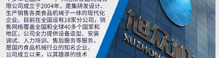 廣州旭眾食品機械有限公司是一家集科研開發(fā),生產設計,營銷服務為一體的現(xiàn)代化生產企業(yè)。現(xiàn)代化生產車間,精湛制造技術,所產機械歷經市場重重考驗,不斷贏得海內外客戶的贊譽。